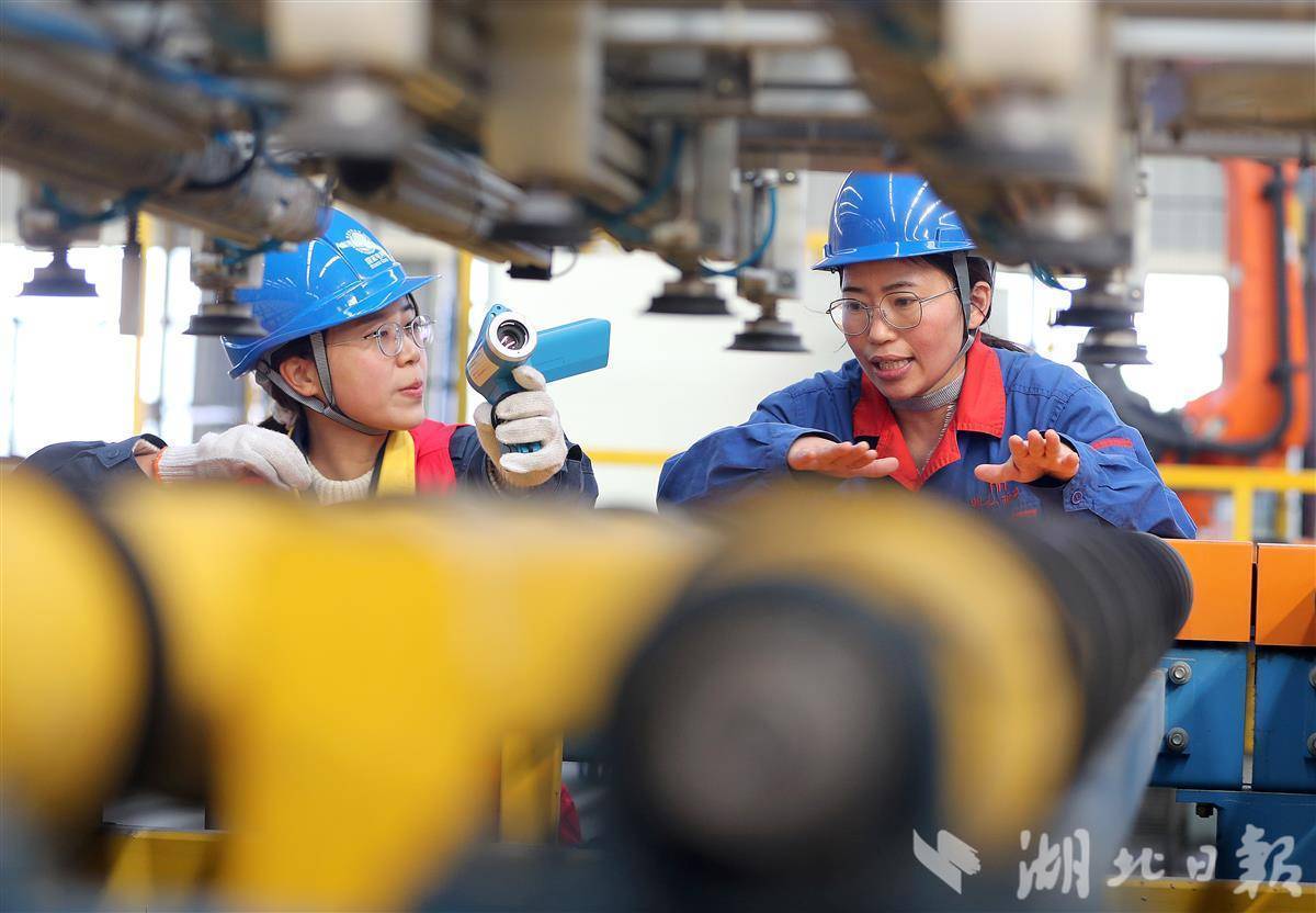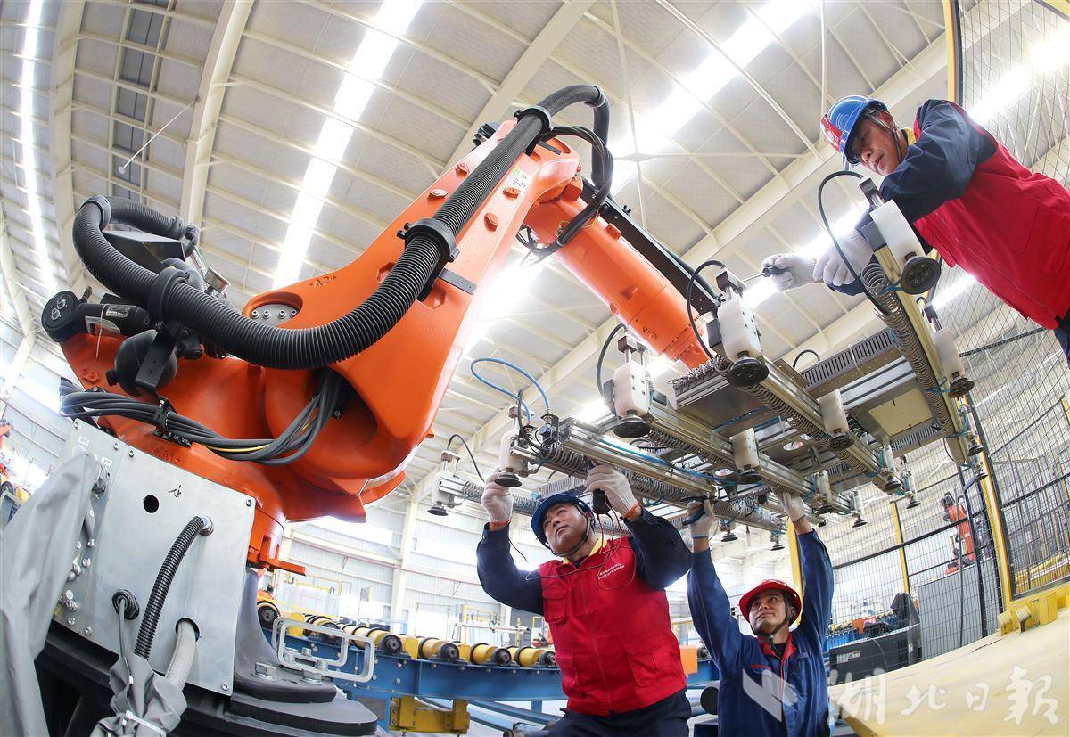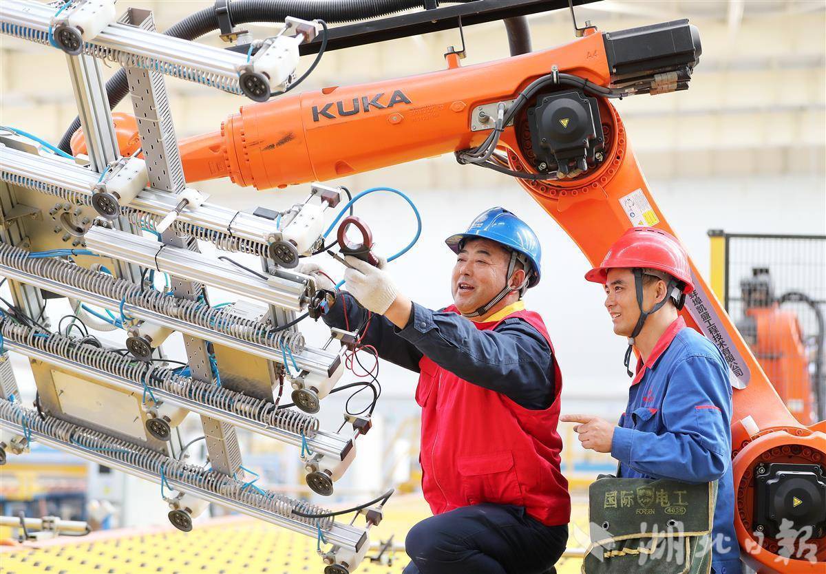 1月13日,位于沙洋县的湖北弘诺玻璃科技有限公司智能化生产车间内,电力技术人员协同企业工程师,对光伏压延玻璃生产线机械臂电力线路进行检查,保障生产线高效稳定运行。