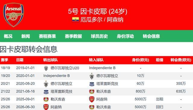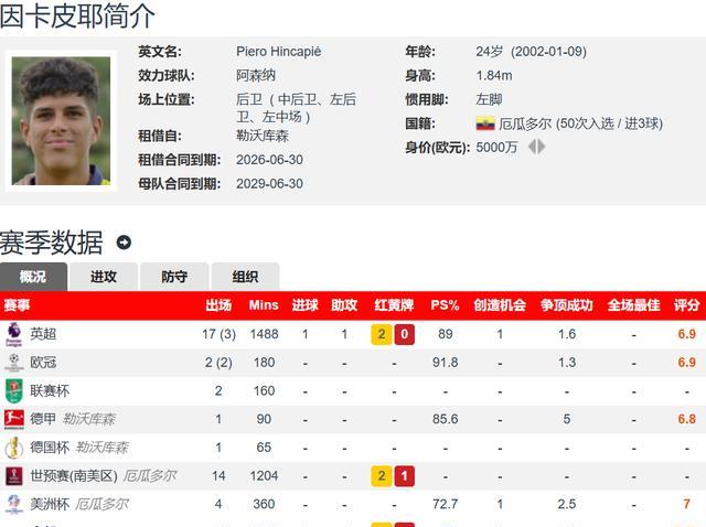 现年24岁的因卡皮耶,身高1.84米,左脚球员,主打中卫位置,也可以踢左后卫,德转估价5000万欧元。因卡皮耶本赛季至今出战了20场英超的比赛,其中17次首发,贡献1球1助,欧冠出场4次,联赛杯出场2次。阿森纳考虑到财务方面的原因,先租后买引进因卡皮耶,俱乐部已经决定今年夏窗以4500万英镑永久性引进因卡皮耶。阿森纳在中卫位置上,除了加布里埃尔和萨利巴之外,还有因卡皮耶和莫斯克拉,可谓是双保险。得防守得天下,阿森纳凭借着最强防线+角球已经成为五大联赛最强球队之一。