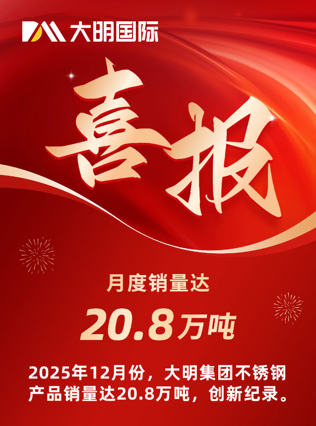 2025年12月份,大明集团实现不锈钢产品销量20.8万吨,创下历史新高的同时,还实现了月度不锈钢销量第4次突破20万吨大关。同时,核心经营数据也表现亮眼:12月份集团品种钢销量同比增长10%,深加工费收入同比增长18%,库存周转天数同比下降2天;全年316L、双相钢、汽车排气系统不锈钢等品种均顺利完成增长指标,经营质效实现持续稳步提升,全年量利齐增已成定局。